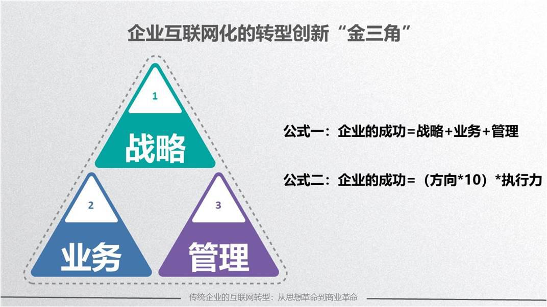 还有,传统的战略管理一般不会涉及到诸如业务设计等更微观一点的业务层面的内容。一般的管理咨询公司也不会提供有关这方面的服务。但互联网转型与创新战略是与微观的业务设计、业务结构、业务流程等紧密相关的。所以在业务战略及更往下的方向上,互联网的创新企业管理范式会有更多部分涉及到业务层级的内容。换言之,要落地,不能只飘在天上。