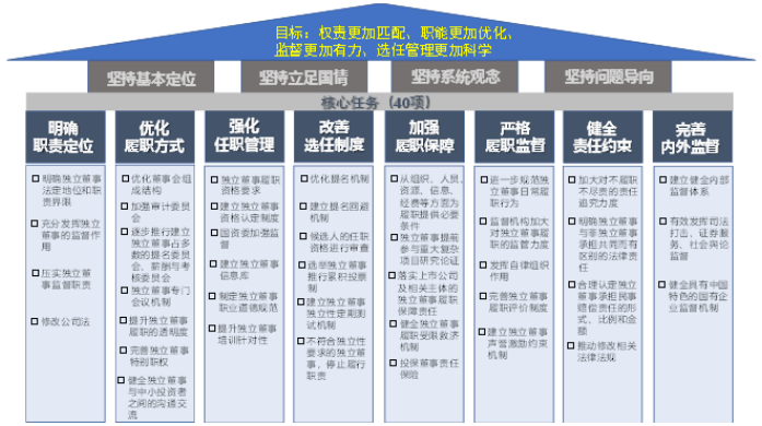 通过该图,可以清晰看到,本次改革的核心要点可以总结为:一个目标、四项原则、八项内容、40个任务。其中: