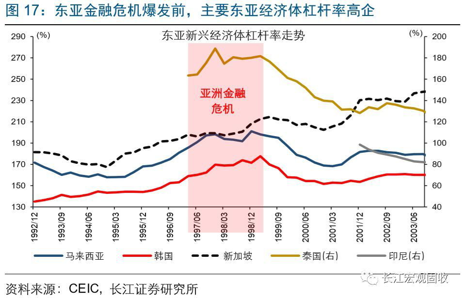 抑制资本外流过程中,新兴央行被动式地收紧货币政策,也曾将新兴经济体本身拖入困境、甚至衰退。新兴央行为抑制资本外流,往往被迫持续、大幅加息。若国内杠杆高企,被动式地大幅加息很可能导致新兴经济体被迫去杠杆,最终陷入困境、甚至衰退。回溯历史,1996年后,韩国、马来西亚和泰国等东亚央行为缓解资本外流压力大幅加息,例如,韩国央行将无风险利率由10%左右升至25%以上;由于国内杠杆高企,不断抬升的利率水平最终将韩国、马来西亚和泰国等拖入经济衰退泥沼,引爆亚洲金融危机。