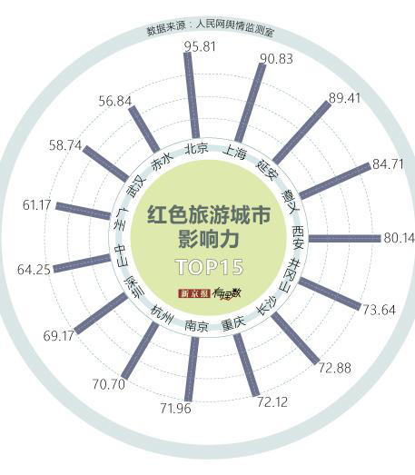 由于红色旅游资源及相关配套产业的地区分布不均,人民网舆情数据中心《2017年红色旅游影响力报告》显示,综合舆论传播、搜索指数、游客评价等多项数据,北京、上海、延安、遵义、西安等5座城市的红色旅游品牌影响力最大。