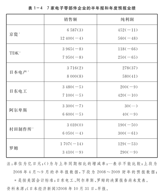 电子零部件企业的半年报和年度预报业绩情况如表1-4所示,除日本电产之外各企业的业绩均有大幅度下滑。