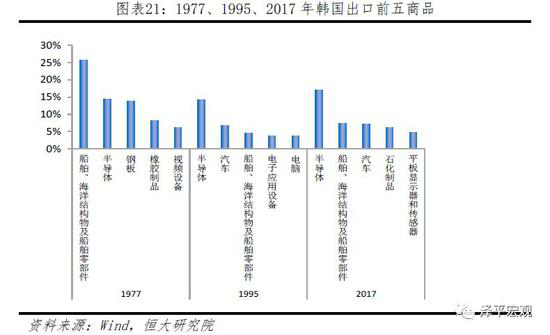 对比1977、1995和2017年韩国出口的前五大商品可以发现,产品结构明显升级,从重工、低端制成品转为半导体、汽车等高科技产品。其中,半导体是多年出口占据前五且占比稳定上升的唯一产品。